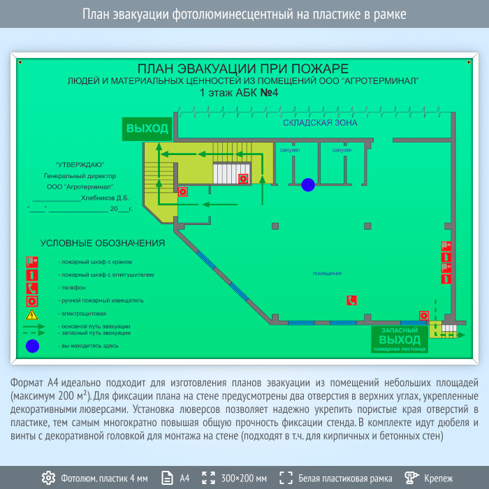 Предлагаем изготовление планов эвакуации А4-А0 форматов. В стоимость изготовления фотолюминесцентных планов эвакуации по ГОСТ 34428-2018 на пластике в рамке входит: разработка и согласование макета, прямая УФ-печать на прозрачном ПЭТ с последующим ее соединением с пластиковой основой с фотолюминесцентным слоем по ГОСТ 12.4.026-2015 и обрамлением в белый пластиковый багет