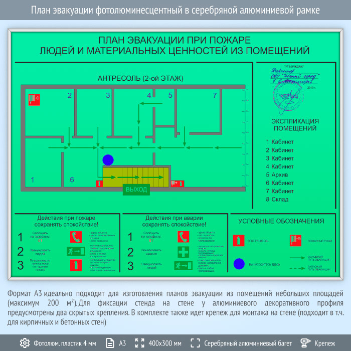 План эвакуации фотолюминесцентный в серебряной алюминиевой рамке (А3 формат) в Черкесске купить