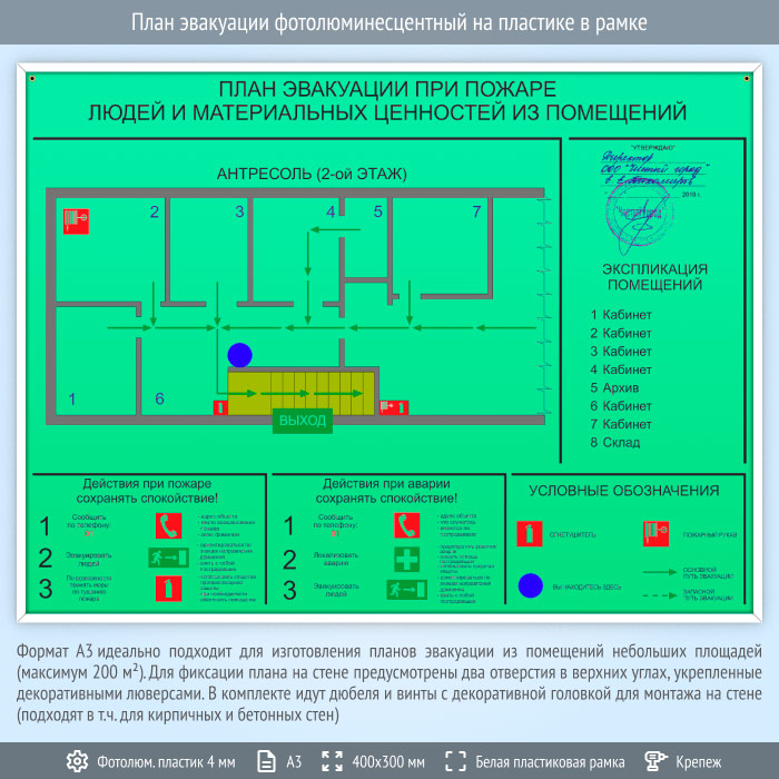 План эвакуации фотолюминесцентный на пластике в рамке (А3 формат) в Черкесске купить