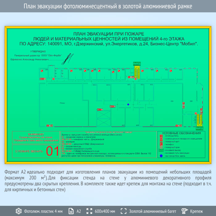 План эвакуации фотолюминесцентный в золотой алюминиевой рамке (А2 формат) в Черкесске купить