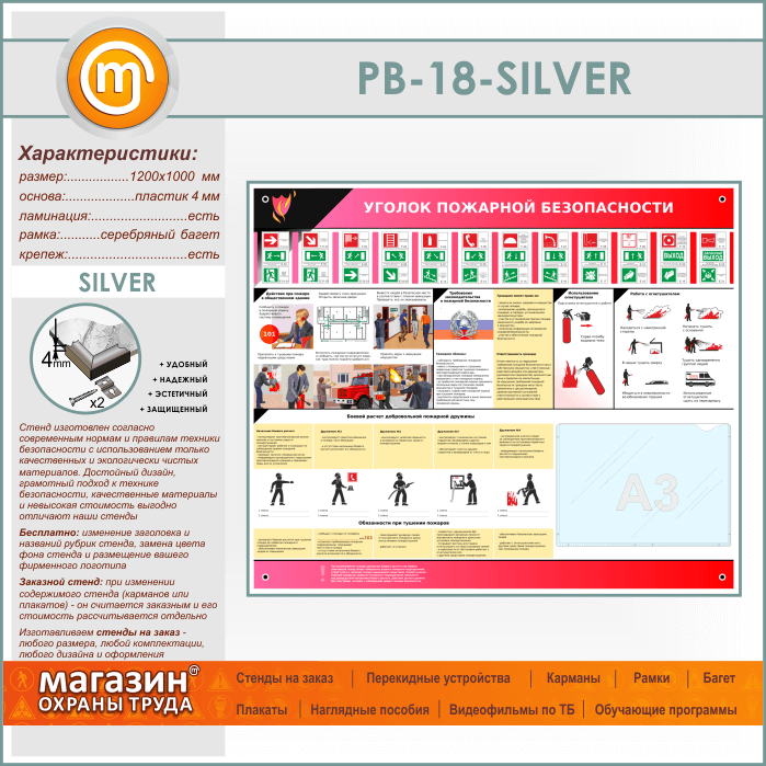 Стенд «Уголок пожарной безопасности» с карманом А3 формата (PB-18-SILVER) в Черкесске купить