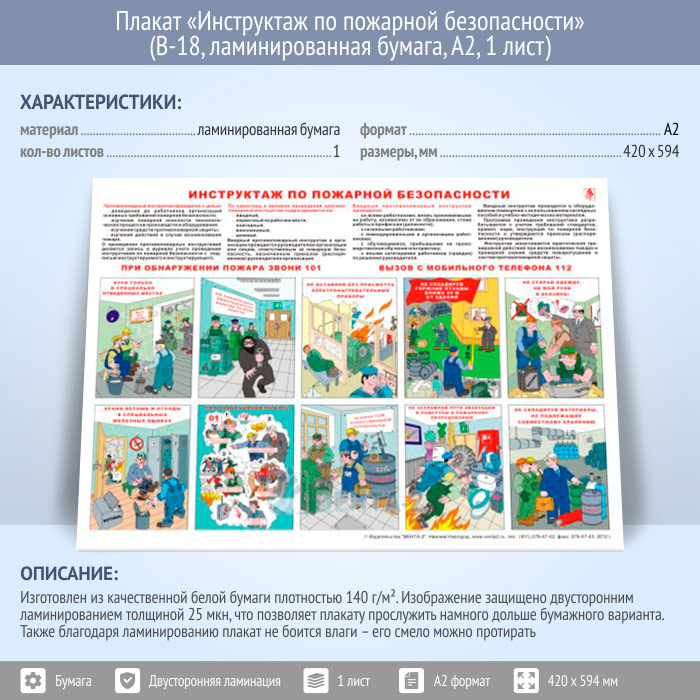 Плакат «Инструктаж по пожарной безопасности» (В-18, ламинированная бумага, А2, 1 лист) в Черкесске купить