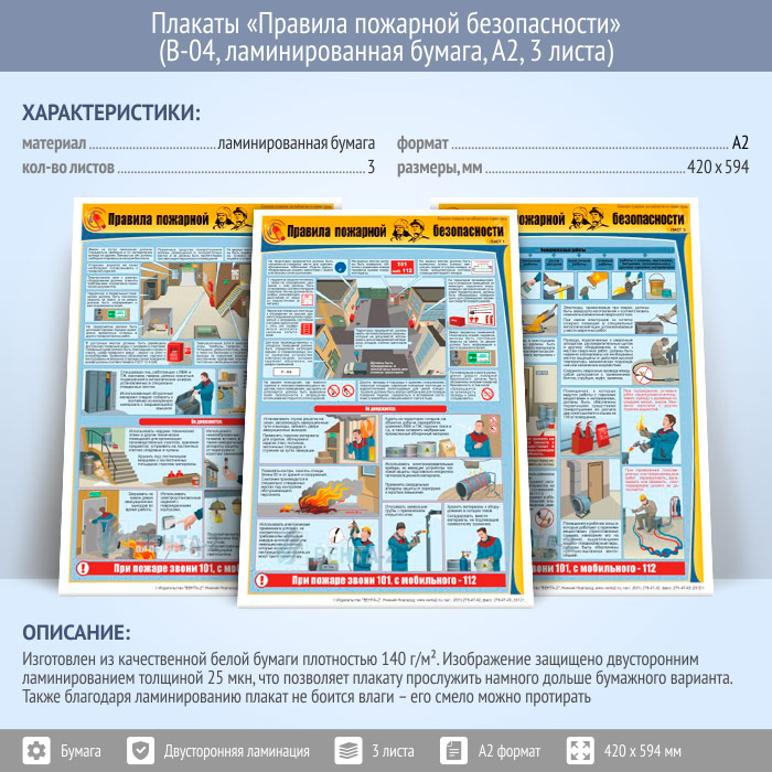 Плакаты «Правила пожарной безопасности» (В-04, ламинированная бумага, А2, 3 листа) в Черкесске купить