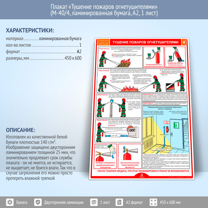 Плакат «Тушение пожаров огнетушителями» (М-40/4, ламинированная бумага, А2, 1 лист) в Черкесске купить