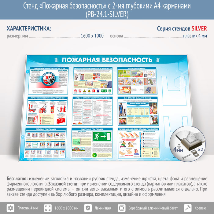 Стенд «Пожарная безопасность» с 2-мя глубокими А4 карманами (PB-24.1-SILVER) в Черкесске купить