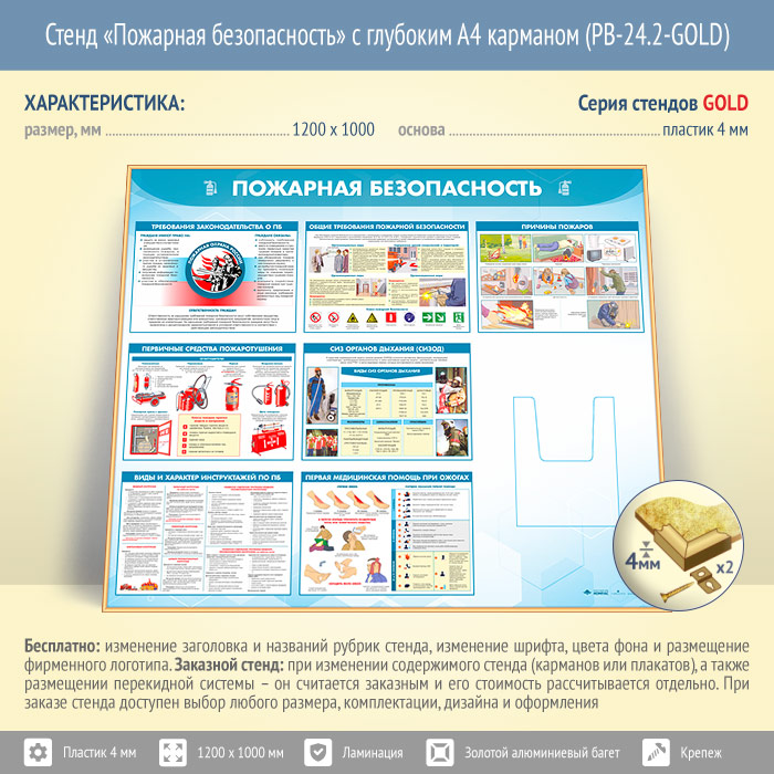 Стенд «Пожарная безопасность» с глубоким А4 карманом (PB-24.2-GOLD) в Черкесске купить
