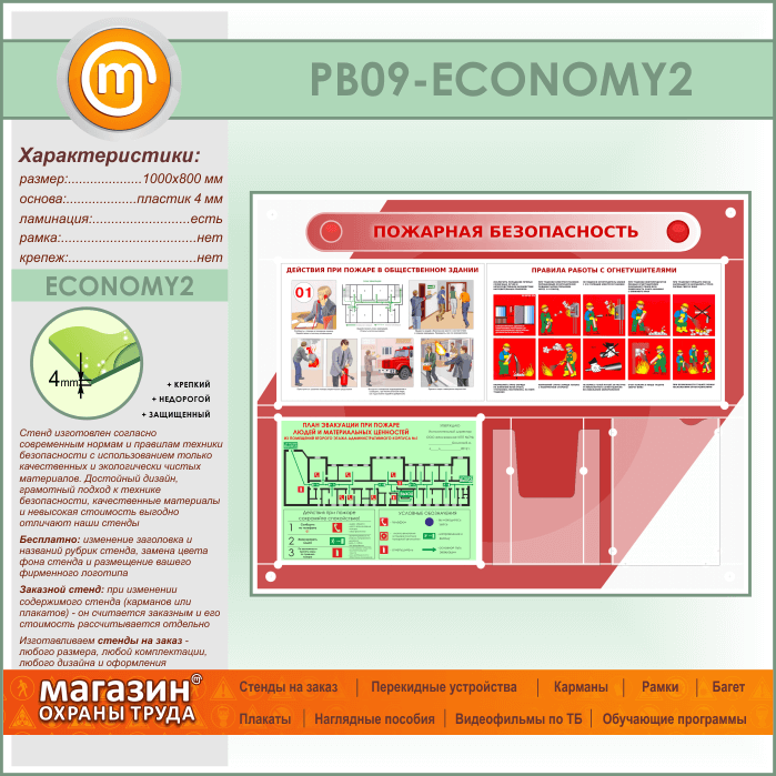 Стенд «Пожарная безопасность» с планом эвакуации, плоским и объемным карманами (PB-09-ECONOMY2) в Черкесске купить