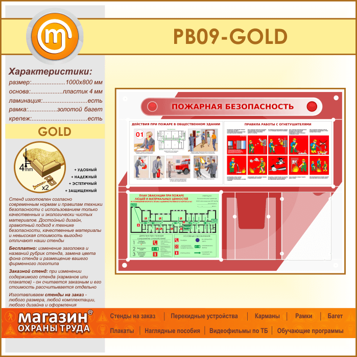 Стенд «Пожарная безопасность» с планом эвакуации, плоским и объемным карманами (PB-09-GOLD) в Черкесске купить