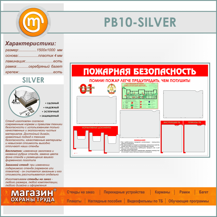 Стенд «Пожарная безопасность» с планом эвакуации, 5 плоскими и 3 объемными карманами (PB-10-SILVER) в Черкесске купить