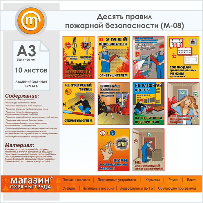 Плакаты «Десять правил пожарной безопасности» (М-08, ламинированная бумага, А3, 10 листов) в Черкесске купить