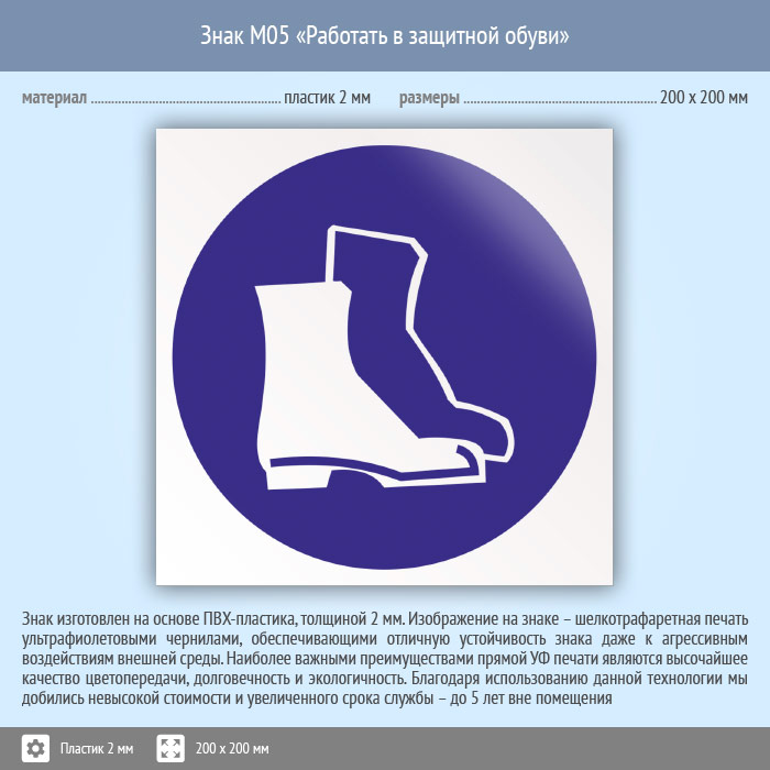 Знак M05 «Работать в защитной обуви» (пластик, 200х200 мм) в Черкесске купить