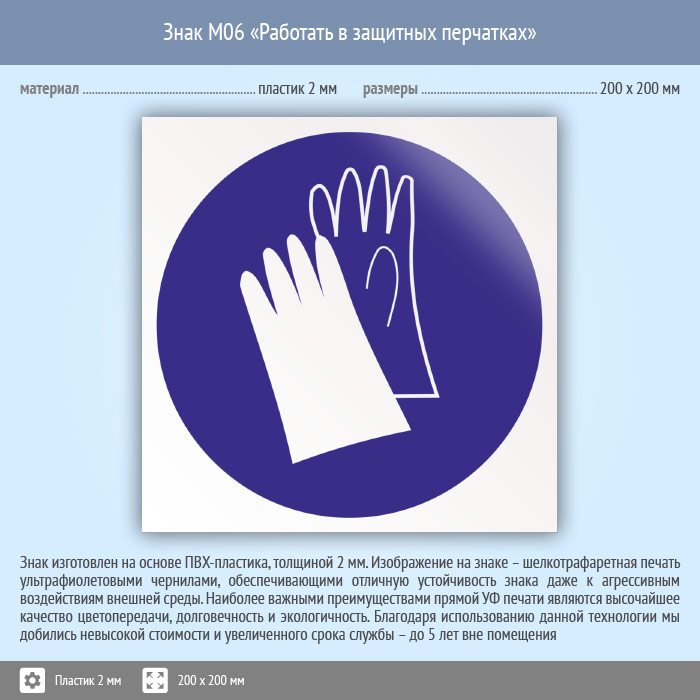 Знак M06 «Работать в защитных перчатках» (пластик, 200х200 мм) в Черкесске купить