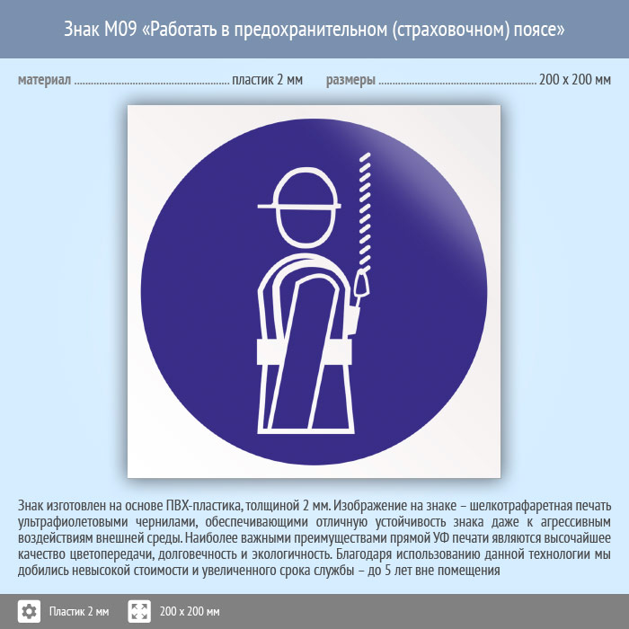 Знак M09 «Работать в предохранительном (страховочном) поясе» (пластик, 200х200 мм) в Черкесске купить