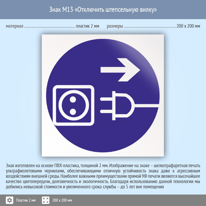 Знак M13 «Отключить штепсельную вилку» (пластик, 200х200 мм) в Черкесске купить