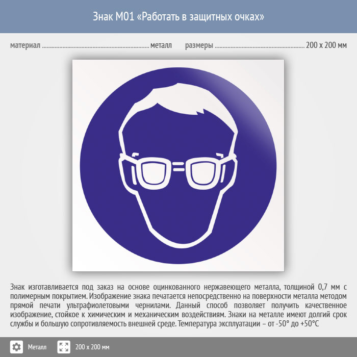 Знак M01 «Работать в защитных очках» (металл, 200х200 мм) в Черкесске купить