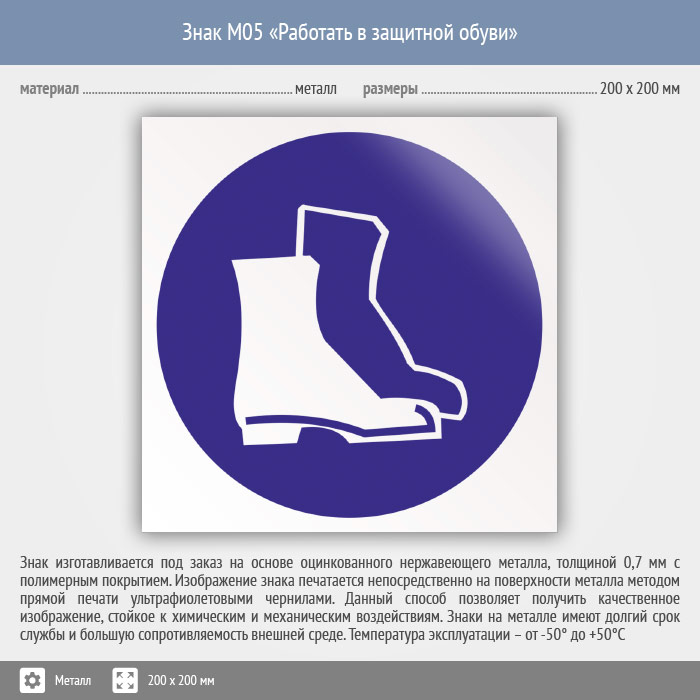 Знак M05 «Работать в защитной обуви» (металл, 200х200 мм) в Черкесске купить