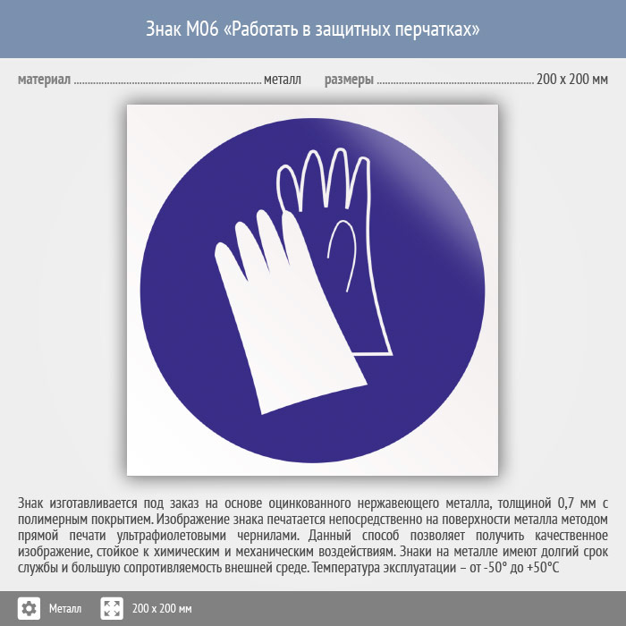Знак M06 «Работать в защитных перчатках» (металл, 200х200 мм) в Черкесске купить
