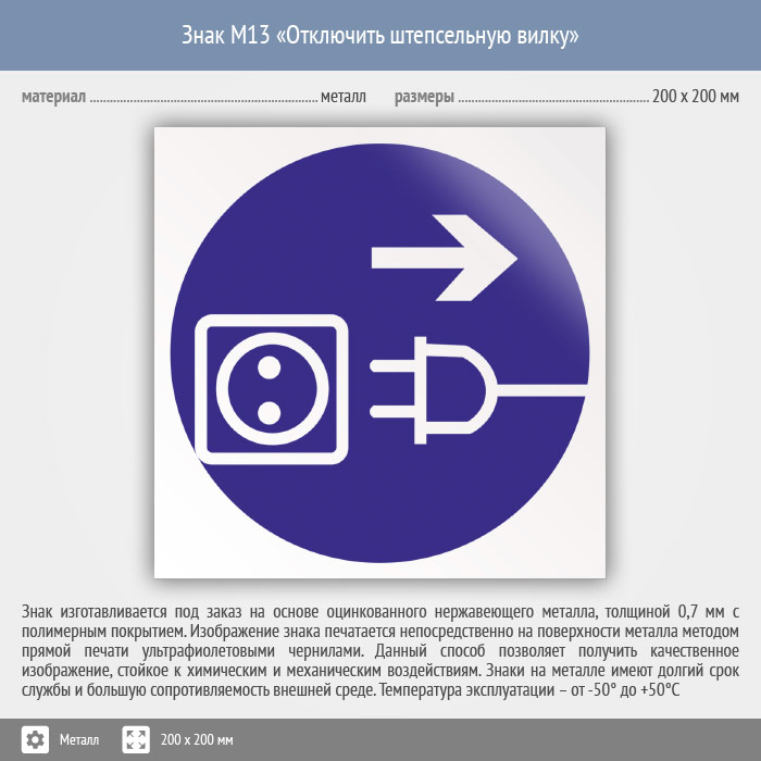 Знак M13 «Отключить штепсельную вилку» (металл, 200х200 мм) в Черкесске купить