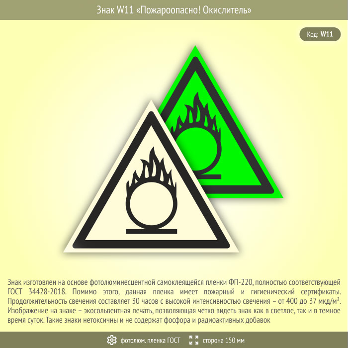 Знак W11 «Пожароопасно! окислитель» (фотолюминесцентная пленка ГОСТ 34428-2018, сторона 150 мм) в Черкесске купить