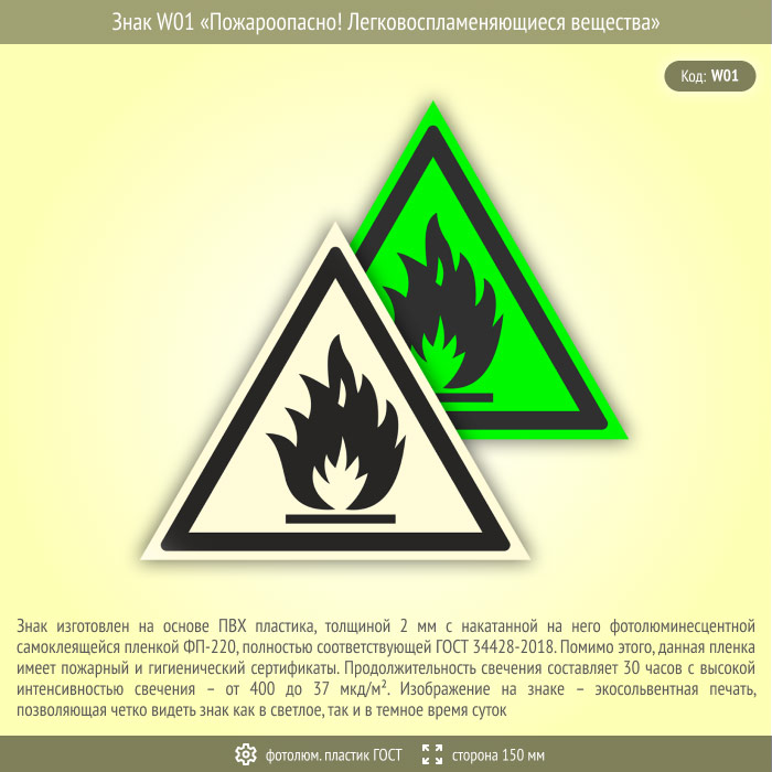 Знак W01 «Пожароопасно! Легковоспламеняющиеся вещества» (фотолюминесцентный пластик ГОСТ 34428-2018, сторона 150 мм) в Черкесске купить
