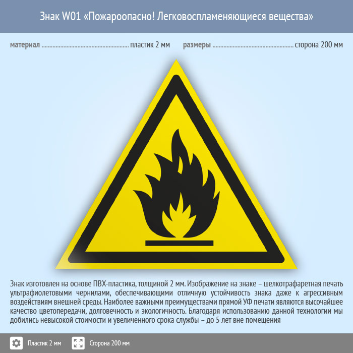 Знак W01 «Пожароопасно! легковоспламеняющиеся вещества» (пластик, сторона 200 мм) в Черкесске купить