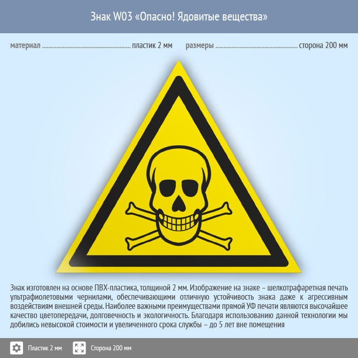 Знак W03 «Опасно! ядовитые вещества» (пластик, сторона 200 мм) в Черкесске купить