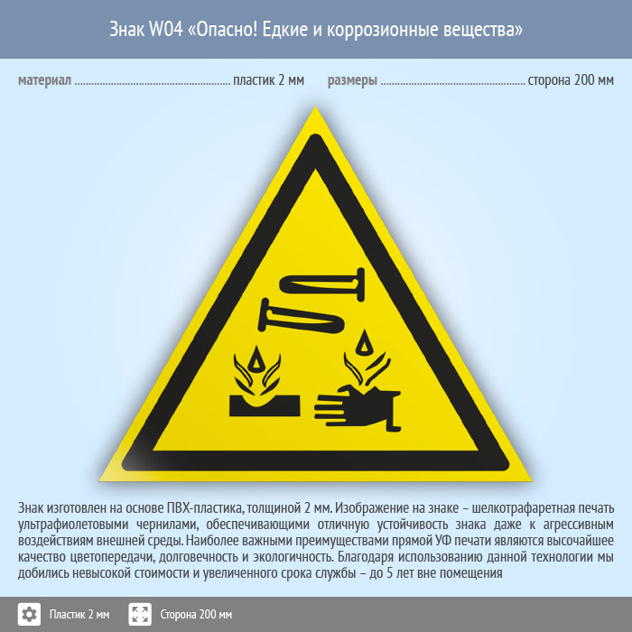 Знак W04 «Опасно! едкие и коррозионные вещества» (пластик, сторона 200 мм) в Черкесске купить