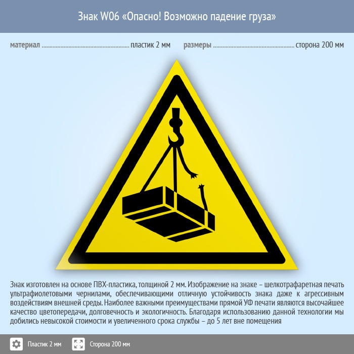 Знак W06 «Опасно! возможно падение груза» (пластик, сторона 200 мм) в Черкесске купить