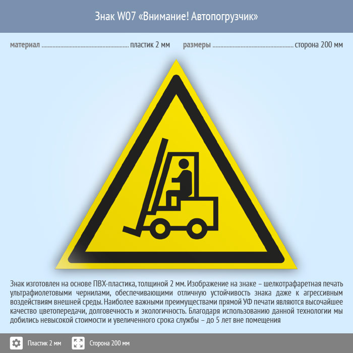 Знак W07 «Внимание! автопогрузчик» (пластик, сторона 200 мм) в Черкесске купить