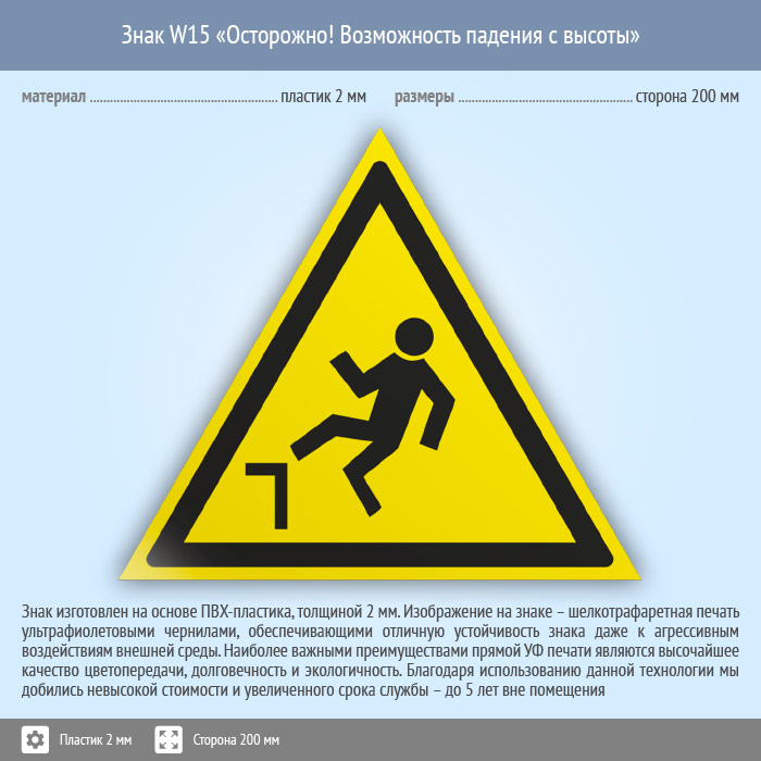 Знак W15 «Осторожно! возможность падения с высоты» (пластик, сторона 200 мм) в Черкесске купить