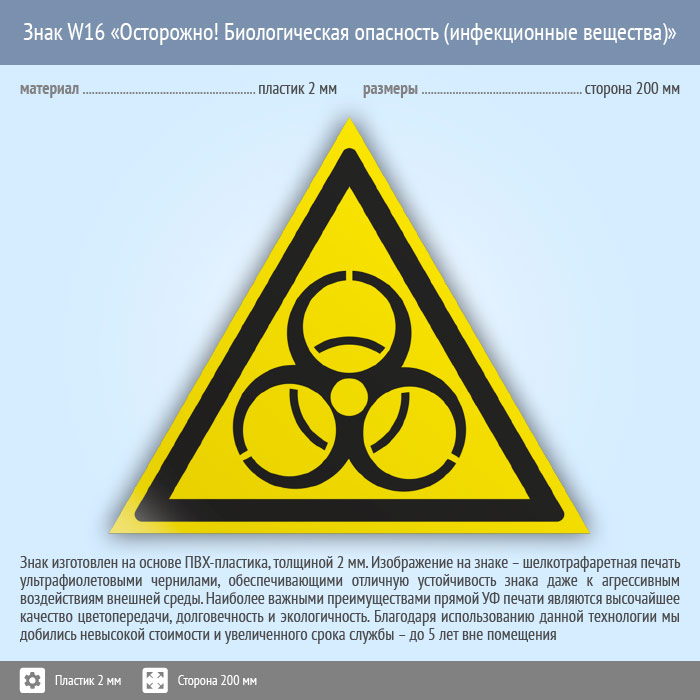 Знак W16 «Осторожно! биологическая опасность (инфекционные вещества)» (пластик, сторона 200 мм) в Черкесске купить