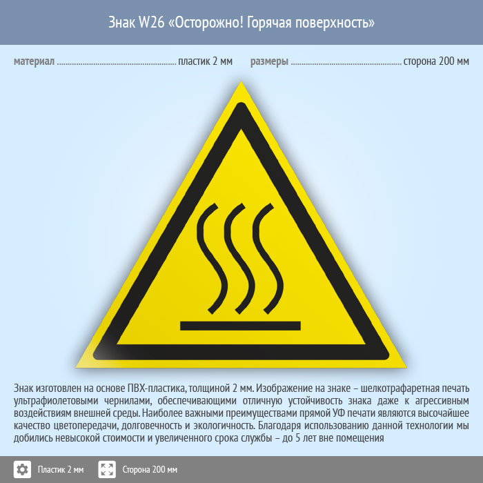Знак W26 «Осторожно! горячая поверхность» (пластик, сторона 200 мм) в Черкесске купить