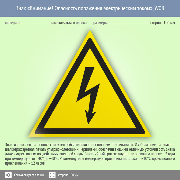 Знак W08 «Внимание! опасность поражения электрическим током» (пленка, сторона 100 мм) в Черкесске купить