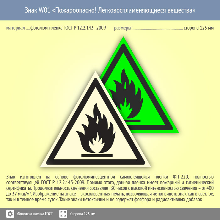 Знак W01 «Пожароопасно! легковоспламеняющиеся вещества» (фотолюминесцентная пленка ГОСТ 34428-2018, сторона 125 мм) в Черкесске купить