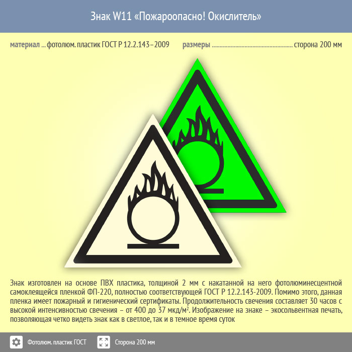 Знак W11 «Пожароопасно! Окислитель» (фотолюминесцентный пластик ГОСТ 34428-2018, сторона 200 мм) в Черкесске купить