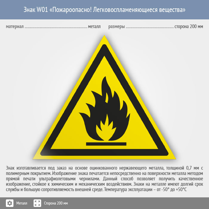Знак W01 «Пожароопасно! легковоспламеняющиеся вещества» (металл, сторона 200 мм) в Черкесске купить