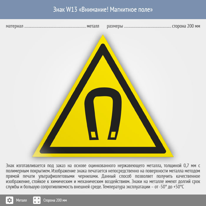 Знак W13 «Внимание! магнитное поле» (металл, сторона 200 мм) в Черкесске купить