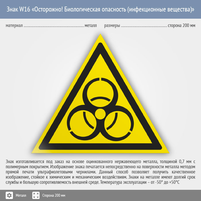 Знак W16 «Осторожно! биологическая опасность (инфекционные вещества)» (металл, сторона 200 мм) в Черкесске купить