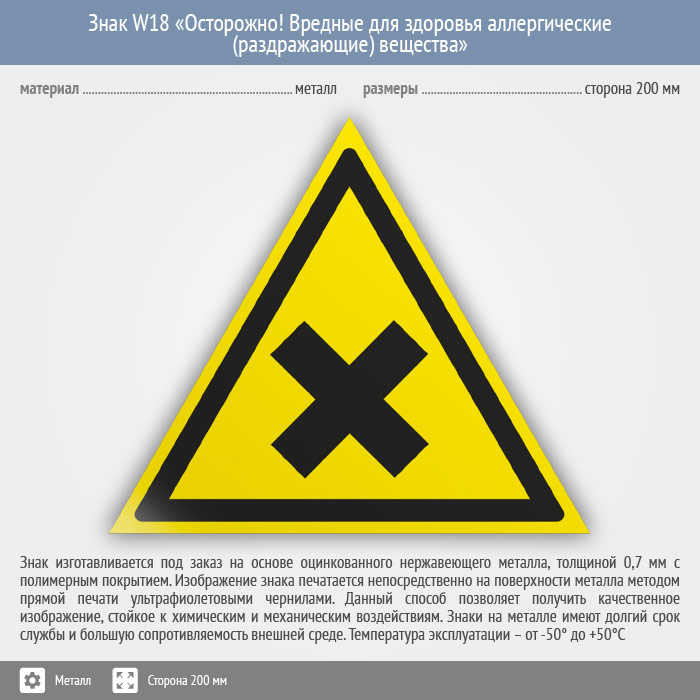 Знак W18 «Осторожно! вредные для здоровья аллергические (раздражающие) вещества» (металл, сторона 200 мм) в Черкесске купить