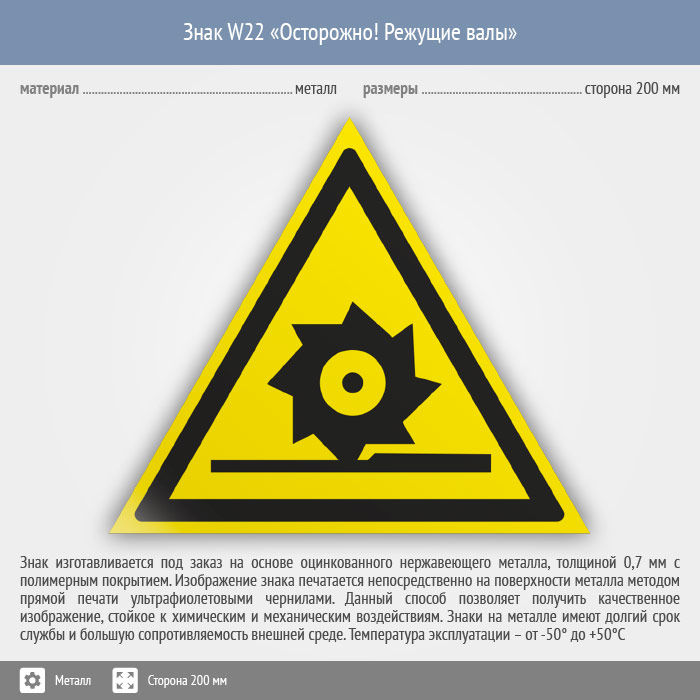 Знак W22 «Осторожно! режущие валы» (металл, сторона 200 мм) в Черкесске купить
