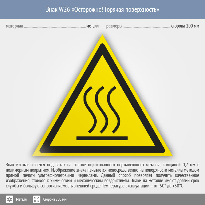 Знак W26 «Осторожно! горячая поверхность» (металл, сторона 200 мм) в Черкесске купить