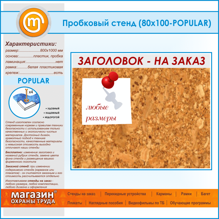 Пробковая доска с заголовком, размером 100х80 см – отличное решение для размещения сменной информации. Основное достоинство пробковой доски – это оперативная и удобная смена информации, ведь вам понадобятся только руки и канцелярские кнопки. Еще одним несомненным плюсом является возможность использования любого формата бумаги, чего не скажешь о карманах. Часто на таких стендах размещают контактные данные, образцы заполняемых бланков, график работы, порядок приема документов в организации и прочее