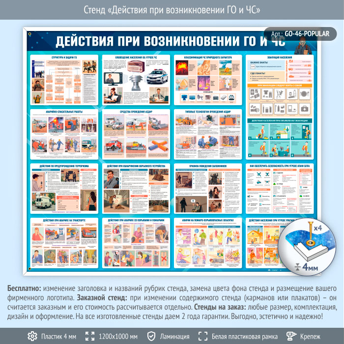 Стенд «Действия при возникновении ГО и ЧС» (GO-46) содержит наглядную информацию о действиях населения при угрозе и возникновении чрезвычайных ситуаций природного, техногенного и социального характера: порядок оповещения и эвакуации, поведение при авариях, взрывах, пожарах, террористической угрозе и применении оружия массового поражения. Представлены схемы гражданской обороны, типовые спасательные работы, правила при обнаружении взрывных устройств и подозрительных предметов, а также меры по обеспечению безопасности и оказанию первой помощи пострадавшим.
