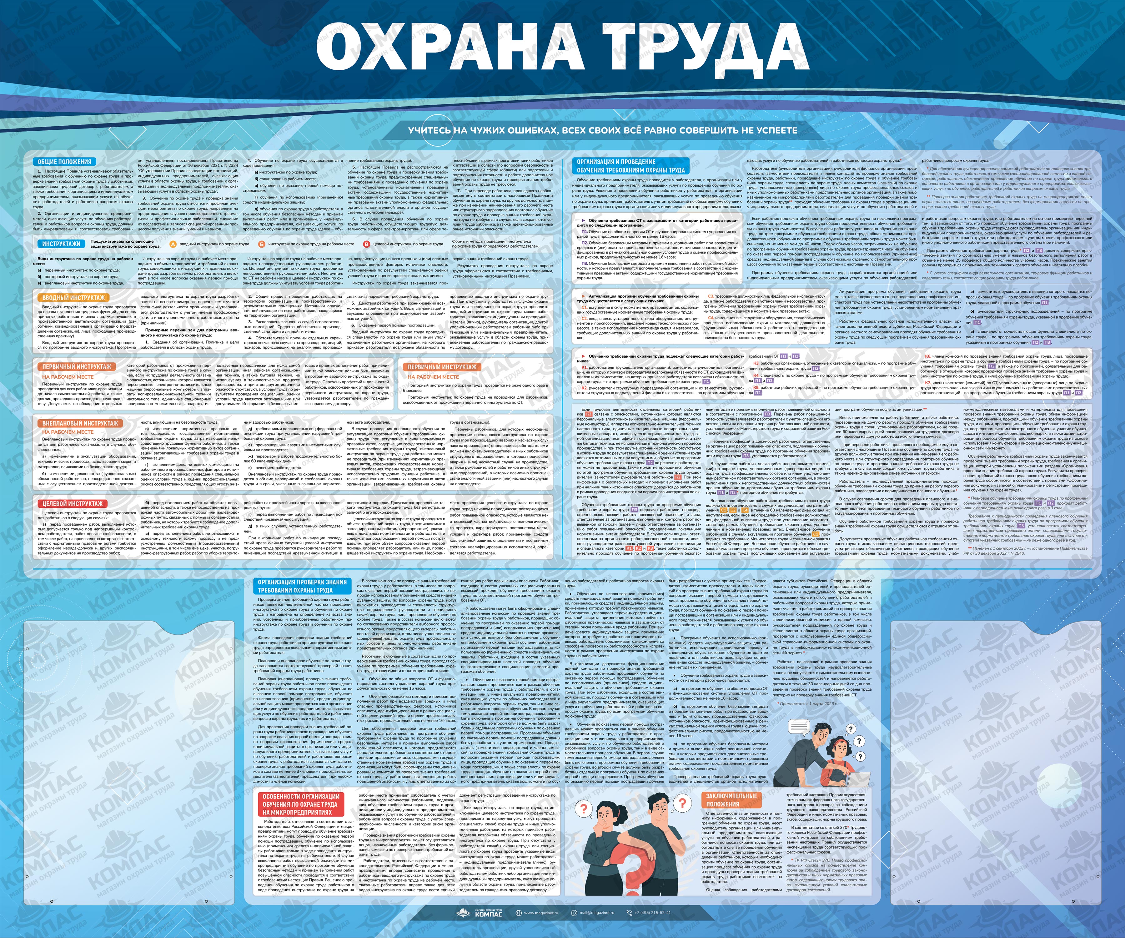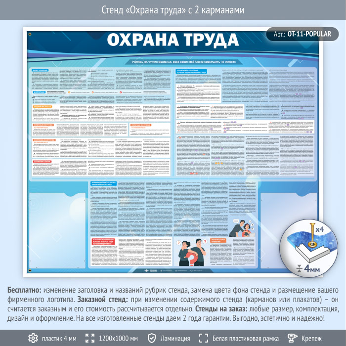 Стенд «Охрана труда» с 2 карманами (OT-11) содержит порядок проведения всех видов инструктажей, информацию об организации и проведении обучения требованиям охраны труда, а также об организации проверки знаний и особенностях организации обучения по ОТ на микропредприятиях.