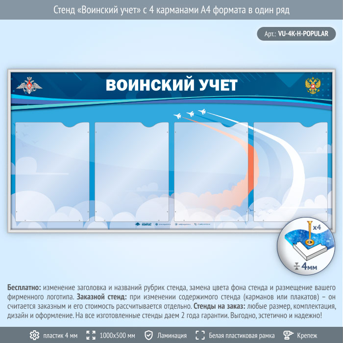 Стенд «Воинский учет» с 4 карманами А4 формата в один ряд (VU-4K-H-POPULAR)