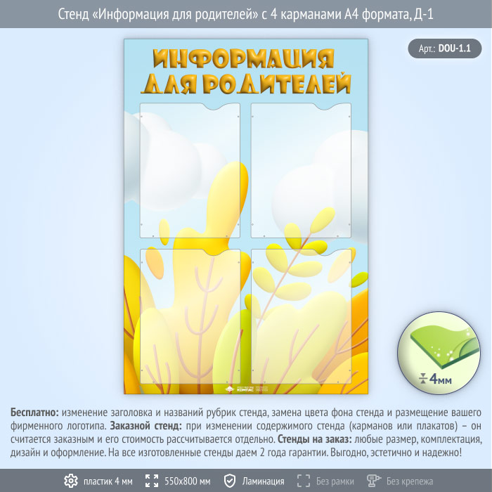 Стенд «Информация для родителей» с 4 карманами А4 формата (DOU-1.1) в Черкесске купить