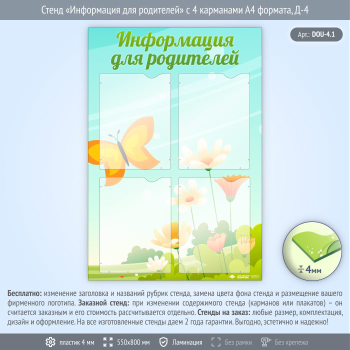Стенд «Информация для родителей» с 4 карманами А4 формата (DOU-4.1) в Черкесске купить