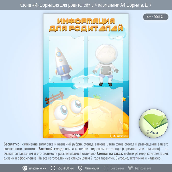 Стенд «Информация для родителей» с 4 карманами А4 формата (DOU-7.1) в Черкесске купить