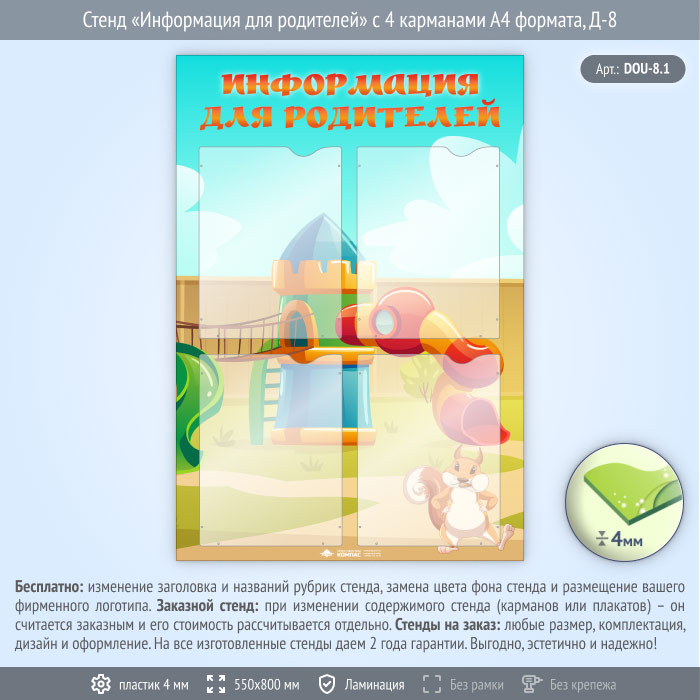 Стенд «Информация для родителей» с 4 карманами А4 формата (DOU-8.1) в Черкесске купить