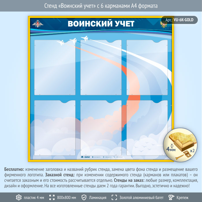 Стенд «Воинский учет» с 6 карманами А4 формата (VU-6K-GOLD) в Черкесске купить